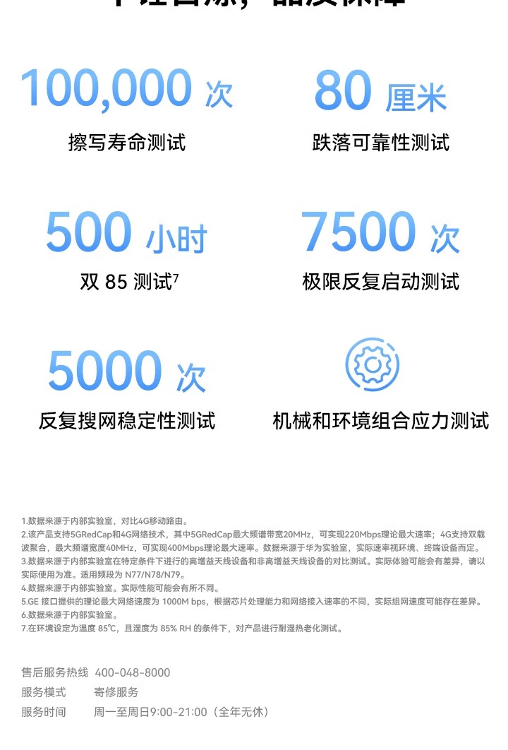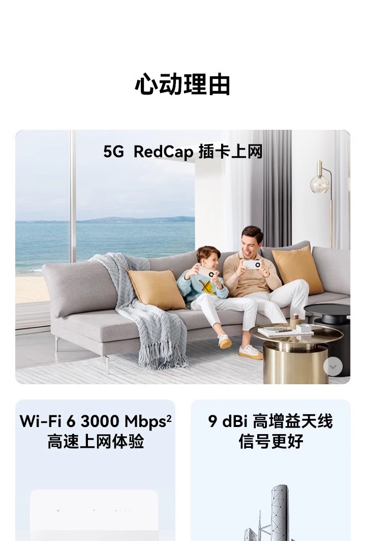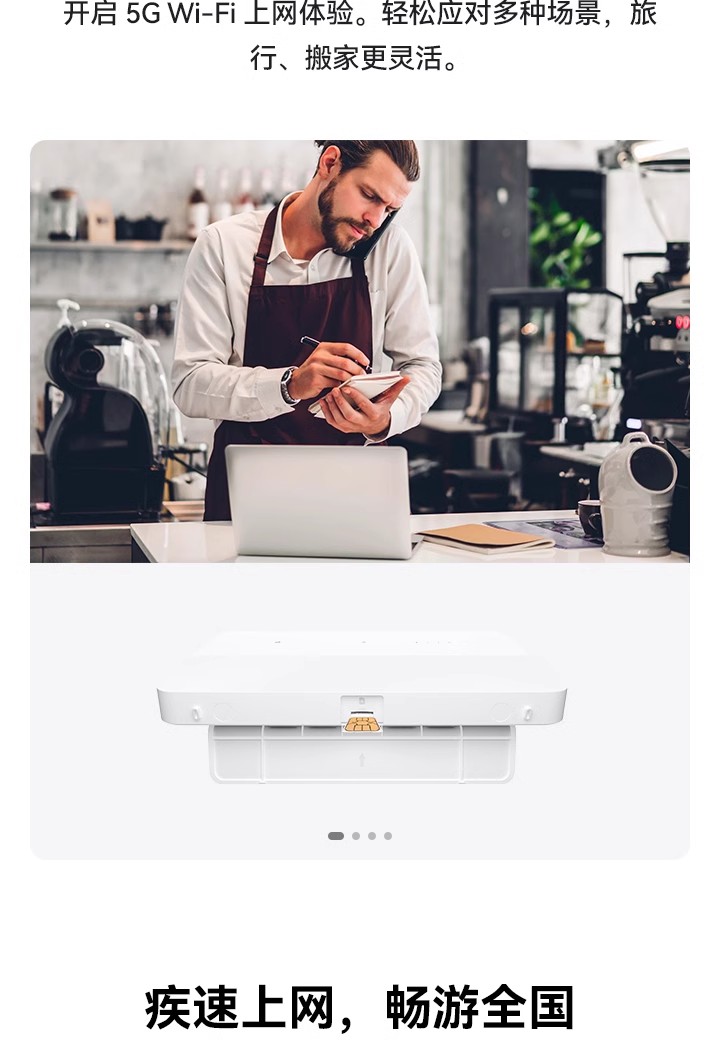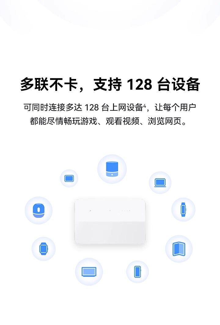 支持4G全网通+移动5G,Wi-Fi 6 疾速体验,高增益智能天线,智能加速 *受运营商管控要求,新疆、西藏、云南地区将限制流量卡使用,不支持购买