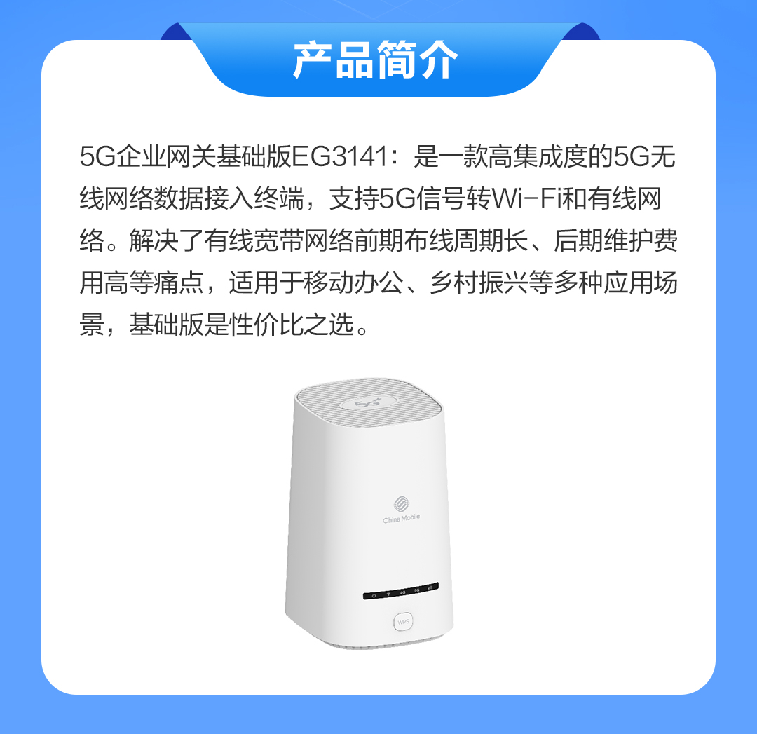 5G 企业网关基础版 EG3141,使用紫光展锐企业级主芯片 IVY510;满足客户设备联网、数据传输等需求,可帮助企业设备设施快速、稳定的连接 5G 网络。