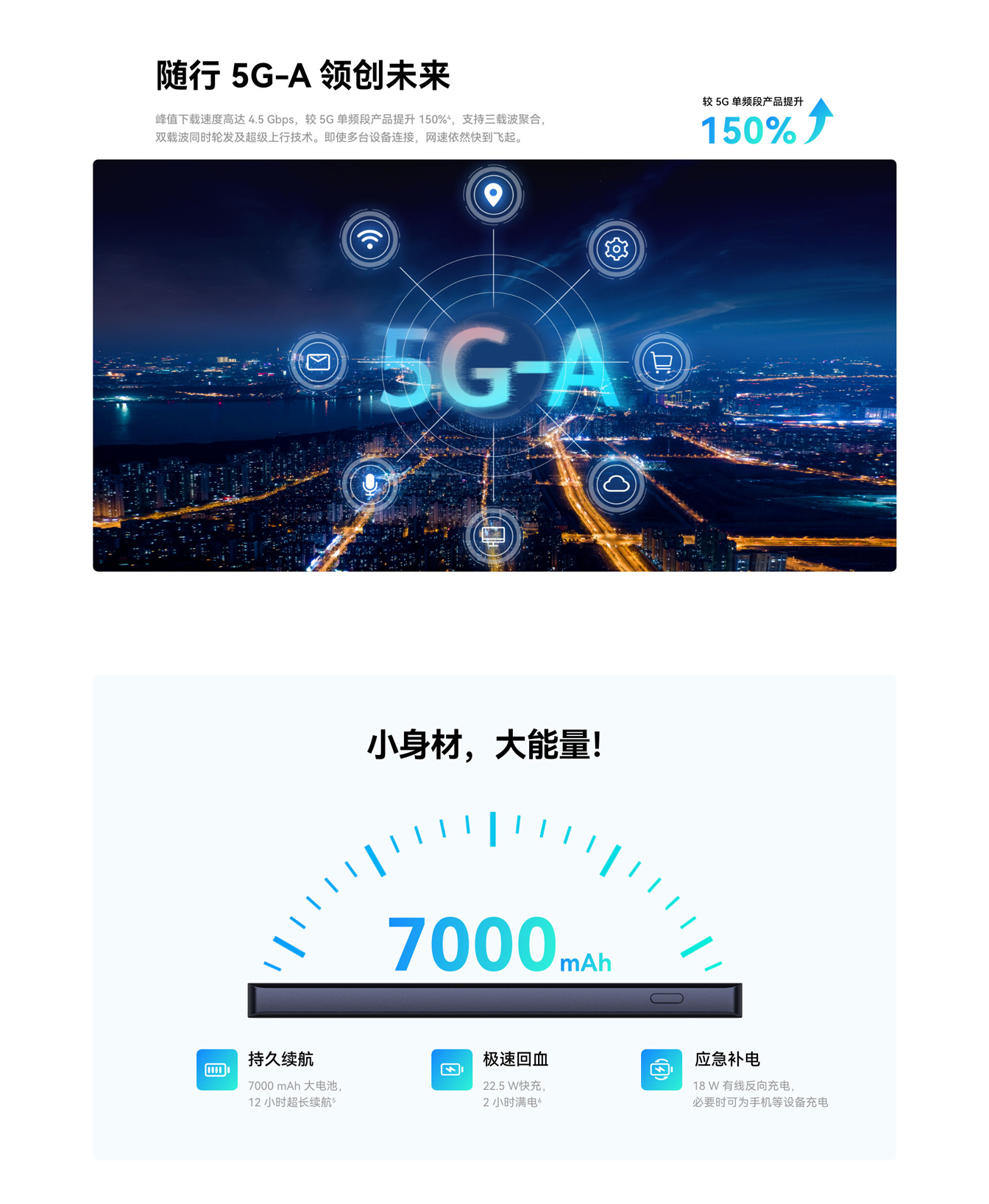 5G-A高速网络,7000mAh 超长续航,智能游戏加速,反向充电 *受运营商管控要求,新疆、西藏、云南地区将限制流量卡使用,不支持购买